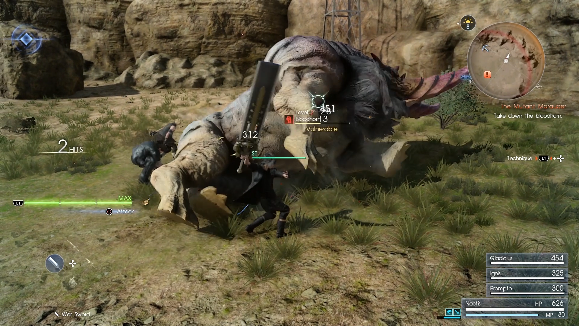 Во время боев Игнис пользуется кинжалами, Гладиолус – двуручными мечами, Промпто – пистолетами. Ноктис же универсал: ему подвластны все виды оружия, включая легендарные, недоступные остальным, и телепортация. Управляем мы только принцем; напарникам же можно лишь приказать сделать суперприем при условии, что соответствующая шкала достаточно заполнена. Из-за этого Final Fantasy XV ощущается менее тактической, чем любая другая номерная часть серии: вместо тщательного планирования поведения всего отряда тут приходится полагаться только на одного героя и трех (а то и больше) AI-болванчиков, никак вам толком не подконтрольных.