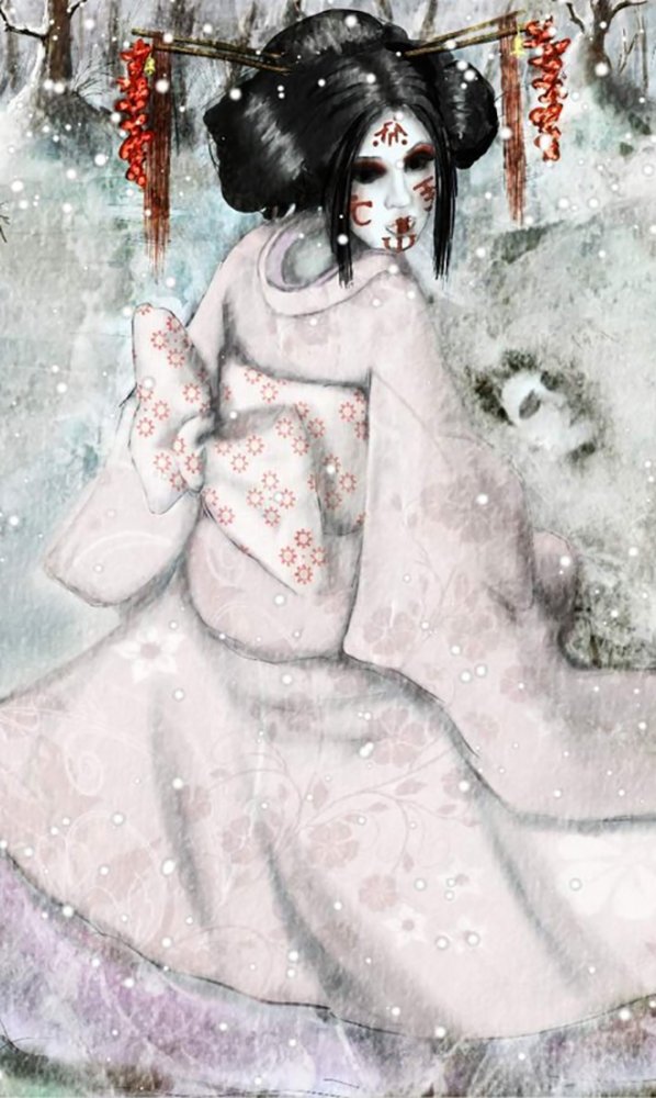 Юки-онна – это дух-ёкай, обитающий в горах острова Хонсю. Описывают его по-разному, но самый известный вариант – удивительно прекрасная девушка с белоснежной кожей и темными (иногда белыми) волосами. Появляется она либо в кимоно, либо полностью обнаженной. Встреча с ней ничем хорошим не заканчивается – она может просто заморозить человека, может высосать из него кровь или заманить в чащу, чтобы он там заблудился и замерз.