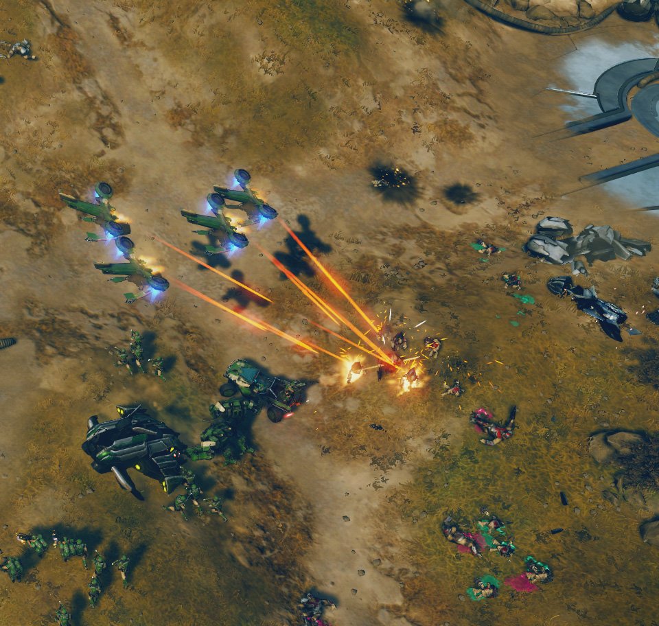 По самым первым миссиям невозможно судить о постановке кампании и о механиках игры – задания явно были обучающими. Полноценные сражения со строительством базы случились только в третьей миссии. Зато уже сейчас видно, что сиквел сохранил одну из главных черт первой части – сражения по-прежнему смотрятся так, будто это привычная «шутерная» часть Halo, за которой мы наблюдаем со стороны. Бойцы не просто стоят на месте, постреливая друг в друга, а маневрируют, уворачиваются от выстрелов, техника передвигается реалистично, играя подвеской и уходя в заносы, взрывы разбрасывают тела по полю боя и вообще война смотрится очень убедительно. Определенно радуют масштабы игры: несмотря на то, что Halo Wars 2 – традиционная RTS в духе Warcraft III и StarCraft, на поле боя постоянно сходятся десятки, а то и сотни бойцов.