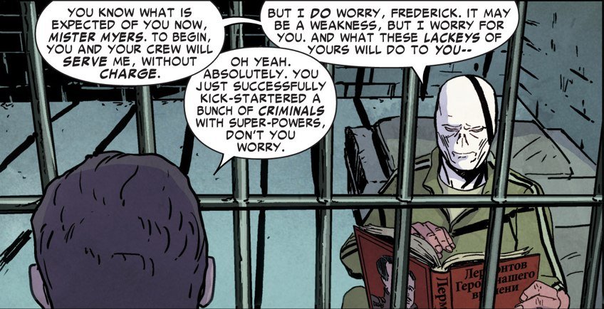 И это не спроста: один из наших «злодеев», Хамелеон, настоящий русский! В тюрьме, например, он читает Лермонтова (ну и «Пятьдесят оттенков серого»). Я специально показал, что у него в руках – «Герой нашего времени», потому что Печорин – отличный антигерой. А у нас про них целый комикс!