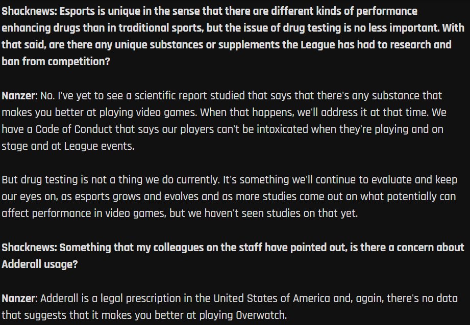 К счастью для игроков в Overwatch, организаторы Overwatch League, в отличие от других киберспортивных лиг, не проверяют игроков на различные препараты, так как комиссар лиги Нейт Нанзер утверждает, что они еще не видели ни одного научного отчета, в котором говорилось бы, что есть такие вещества, благодаря которым ты начнешь лучше играть и чаще побеждать.