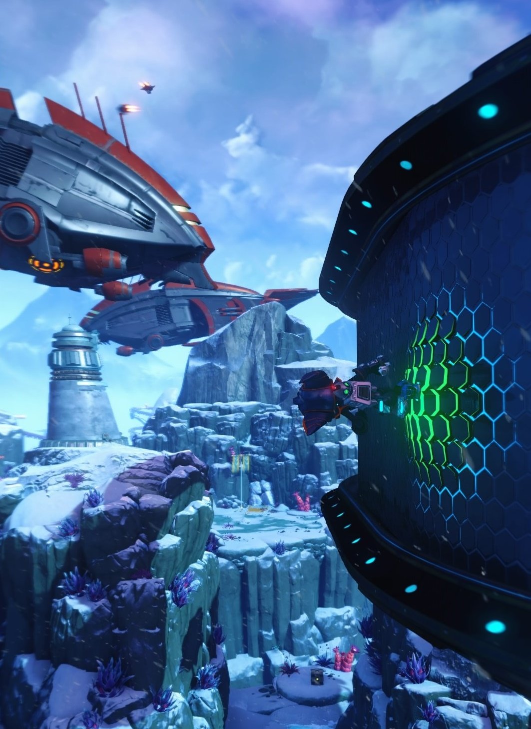 К слову, о самих планетах. Чужие миры радуют уровнем детализации и дальностью прорисовки – картина в Ratchet & Clank яркая, красочная. Разница между CGI и кат-сценами на движке заметна, но не критична. Заснеженные горы, оживленный мегаполис будущего или райский курорт на тропических островах, – уровни неизменно наделены индивидуальностью и зовут облазить каждую тайную тропу в поисках заветных золотых болтов.