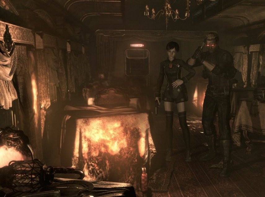 Впрочем, по скриншотам так сразу и не скажешь. Capcom заменила модели персонажей на более детализированные, полностью переработала освещение и перерисовала окружение под 1080p. Первая большая локация в игре — поезд — получилась самой красивой. Благодаря переделанному освещению и новым фоновым анимациям вагоны экспресса наполняются уютом и навевают расслабленность, из-за чего встречи с зомби и другими монстрами становятся еще дискомфортнее — увеличивается контраст между внешним спокойствием и напряжением боя. Остальные уровни, будь то особняк или подземная лаборатория, поражают серостью, поэтому подсознательно игру делишь на два акта: поезд и прочую «хмурь».