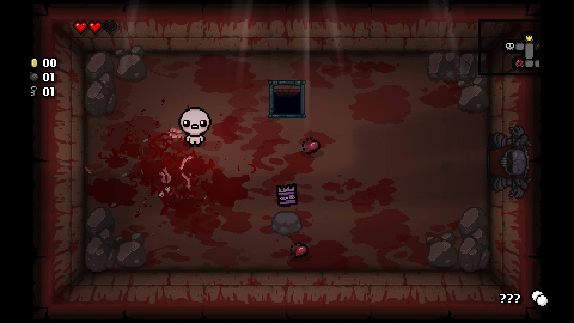 Вот только какое из двух зол, обезумевшая мамаша с кухонным ножом или полный опасностей подвал, меньшее — еще неизвестно. Хоть всевозможные чудовища, шипы, фекалии и прочие нечистоты и выглядят довольно мило (как и Мясной Парень из Super Meat Boy от того же автора, представляющий из себя кусок фарша с глазками), каждый из них может довести Исаака до слез или вовсе убить.